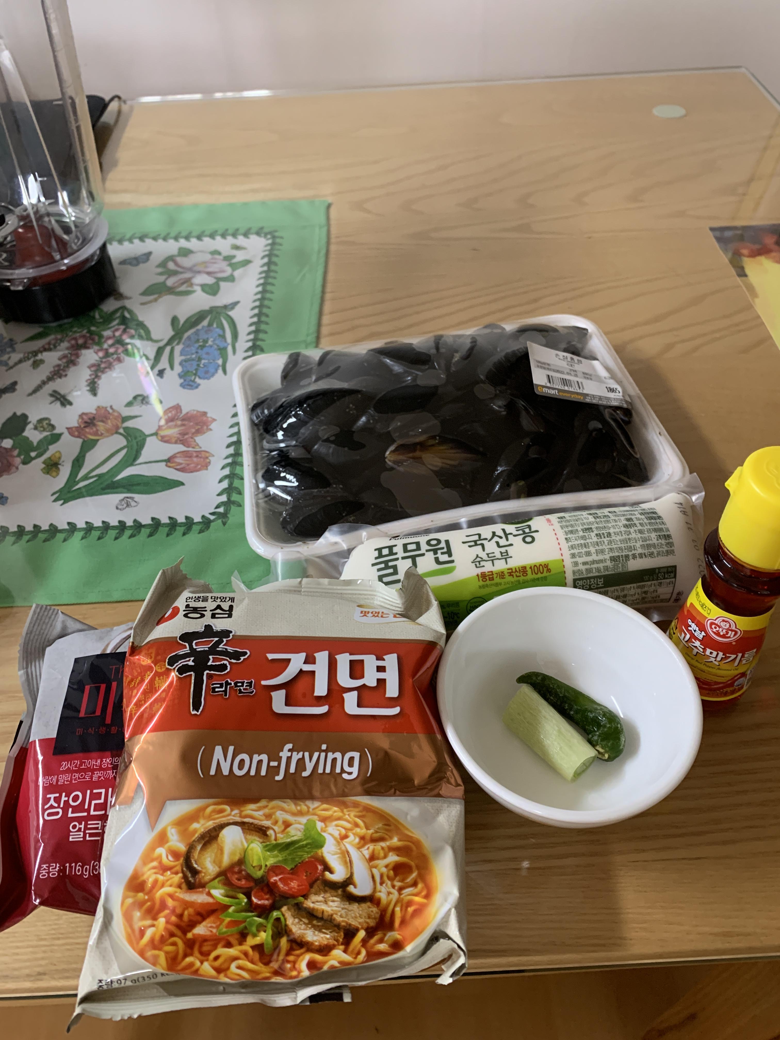 안녕하세요 ~ 여러분 신선의 즐거운 세상입니다. 이번 메뉴는 순두부 건면 라면이에요 ^^* 재료를 한번 보실까요? 재료는 순두부, 건면라면 매운맛 2개, 파, 청양고추, 고추기름, 홍합 이렇게 준비해 주세요 ^^* 냄비에 고추기름을 두르고 청양고추와 파를 썰어서 넣고 볶아주세요. 그리고 물을 부어주고 홍합을 넣어주세요. 그리고 건더기 수프 2개와 분말수프 2개를 넣고 끓여주세요. 끓이면서 면 2개를 넣고 끓여 줍니다. 면까지 달 끓인 상태면 마지막으로 순두부를 잘라서 넣어주세요 그러면 완성 이제 맛있게 드시면 됩니다. 라면을 먹으면 몸에게 엄청 미안하잖아요 그래서 순두부를 넣어서 먹는 건데요. 저는 저의 몸을 엄청나게 생각해서 건면을 선택했어요 근데 청양고추와 고추기름을 넣어서 그런지 얼큰해서 좋았습니다..